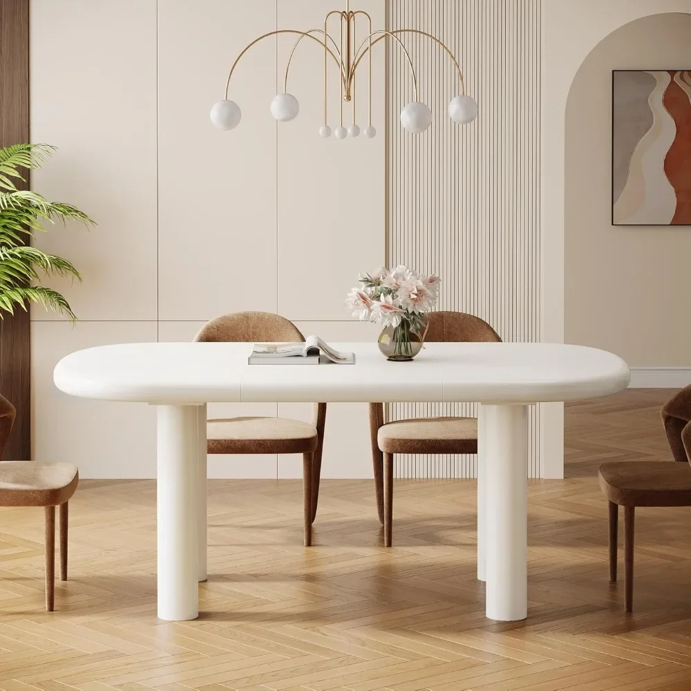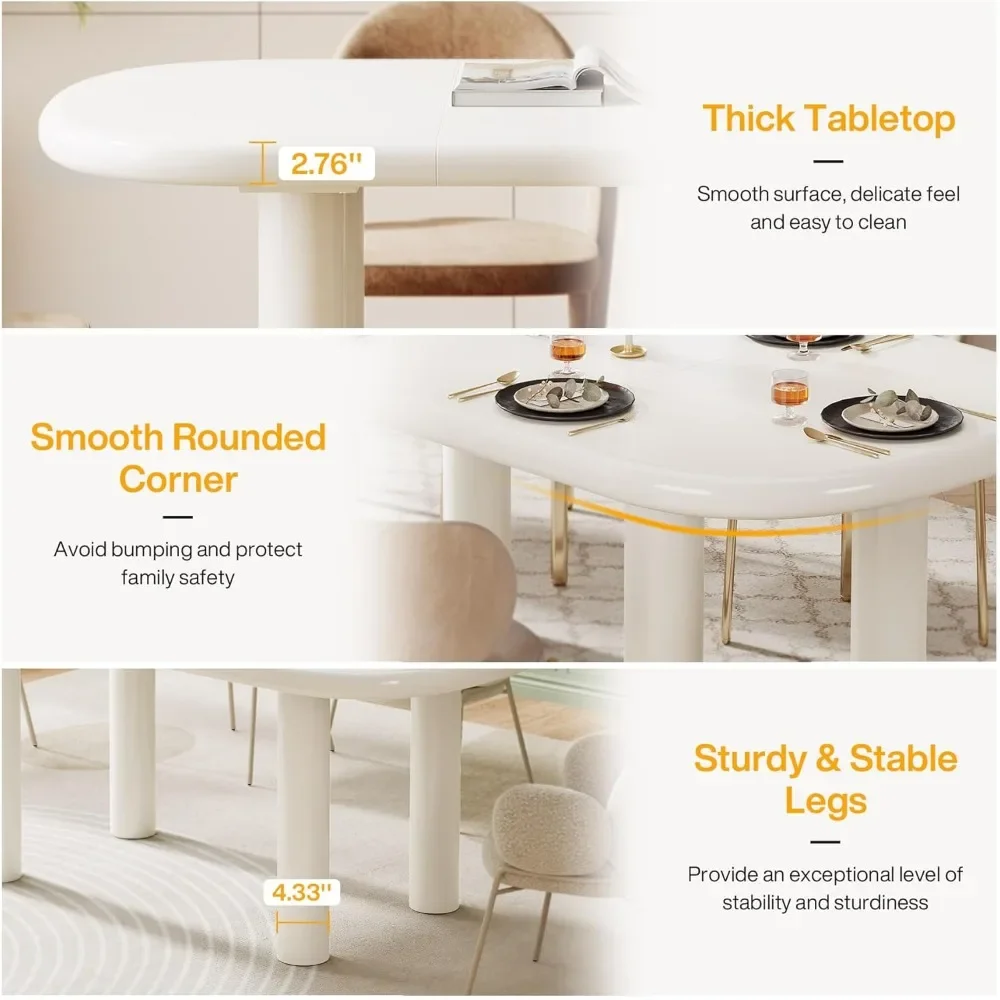 63 Inch Oval Dining Table, Capable of Accommodating 6 People, 63 Inch Modern Cream White Kitchen Table with Cylindrical Legs